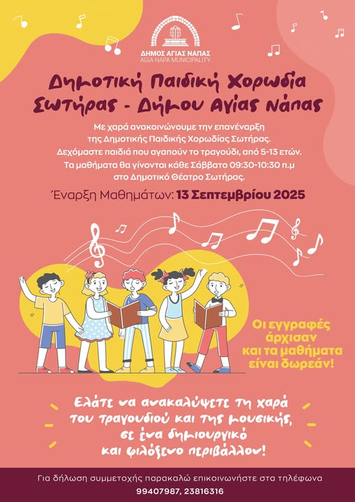 Ο Δήμος Αγίας Νάπας (Δημοτικό Διαμέρισμα Σωτήρας) με χαρά ανακοινώνει την επανέναρξη της Δημοτικής Παιδικής Χορωδίας Σωτήρας, η οποία ανοίγει ξανά τις πόρτες της για παιδιά ηλικίας 5 έως 13 ετών που αγαπούν το τραγούδι και τη μουσική.