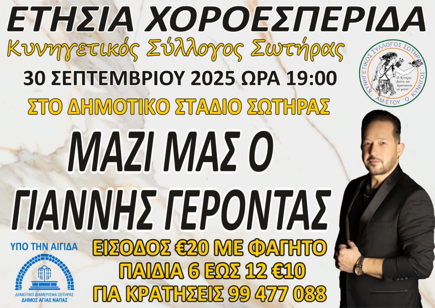 Ο Κυνηγετικός Σύλλογος Σωτήρας σας προσκαλεί στην ετήσια χοροεσπερίδα του, που θα πραγματοποιηθεί την Τρίτη 30/09/25 στο Δημοτικό Στάδιο Σωτήρας.