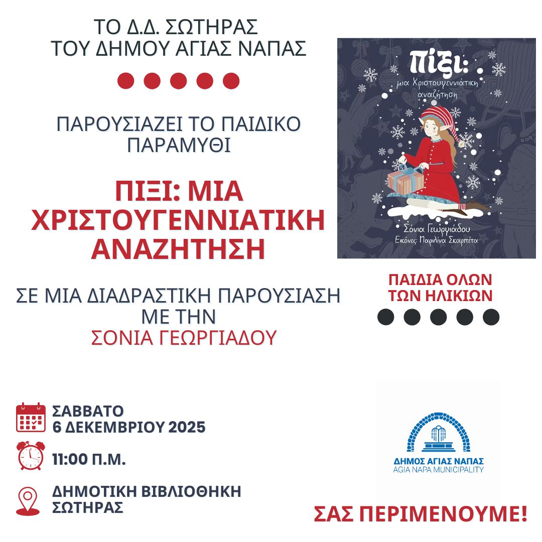 Το Δημοτικό Διαμέρισμα Σωτήρας του Δήμου Αγίας Νάπας διοργανώνει το Σάββατο 6 Δεκεμβρίου 2025 στις 11:00 το πρωί στη Δημοτική Βιβλιοθήκη Σωτήρας μία ξεχωριστή χριστουγεννιάτικη εκδήλωση για παιδιά όλων των ηλικιών.