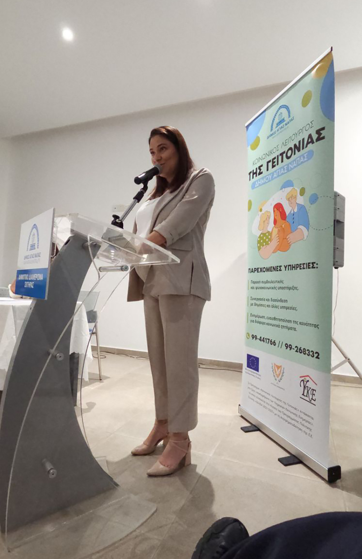 Η Διευθύντρια των Υπηρεσιών Κοινωνικής Ευημερίας, κα. Μαρία Κυρατζή, παρουσίασε το όραμα πίσω από τη δημιουργία του προγράμματος, αναδεικνύοντας τη σημασία της στρατηγικής κοινωνικής πολιτικής και της αξιοποίησης των ευρωπαϊκών πόρων για την ουσιαστική στήριξη των τοπικών κοινωνιών. Οι Κοινωνικοί Λειτουργοί Γειτονιάς του Δήμου Αγίας Νάπας, κα. Άντρη Νικολάου και κα. Ραφαηλία Σταύρου, παρουσίασαν στατιστικά δεδομένα, εμπειρίες και καλές πρακτικές από την καθημερινή τους δράση, δίνοντας έμφαση στις ανθρώπινες ιστορίες και στα αποτελέσματα που έχει επιφέρει το πρόγραμμα στην καθημερινότητα των πολιτών.
