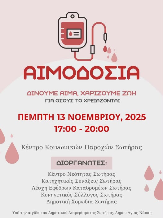 Αιμοδοσία διοργανώνεται στο Δημοτικό Διαμέρισμα Σωτήρας την Πέμπτη 13 Νοεμβρίου και η Ώρα: 17:00 – 20:00 στο Κέντρο Κοινωνικών Παροχών.