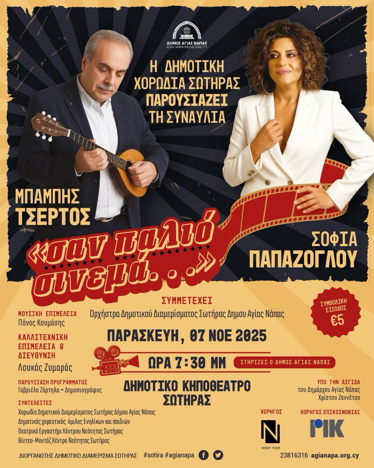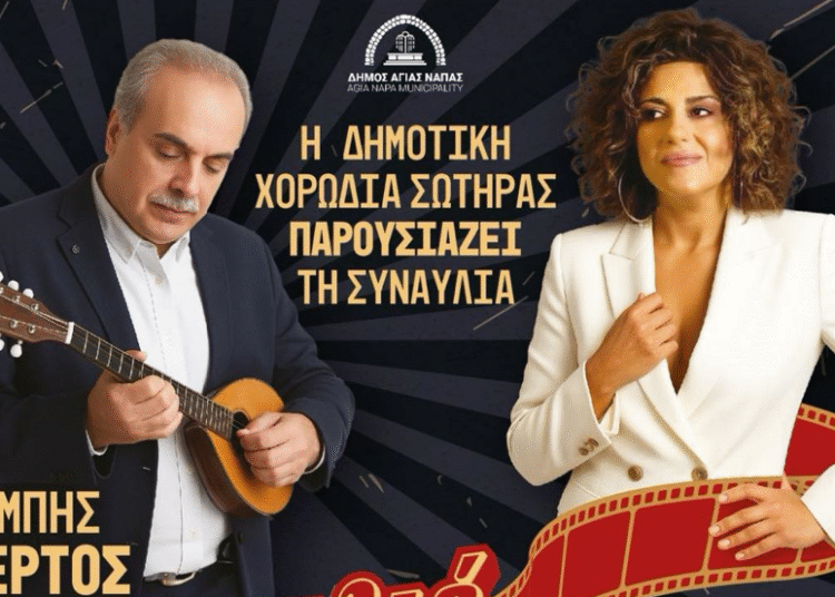 Το Δημοτικό Διαμέρισμα Σωτήρας του Δήμου Αγίας Νάπας διοργανώνει τη συναυλία της Δημοτικής Χορωδίας Σωτήρας με τους Μπάμπη Τσέρτο και Σοφία Παπάζογλου υπό τον τίτλο «Σαν Παλιό Σινεμά».