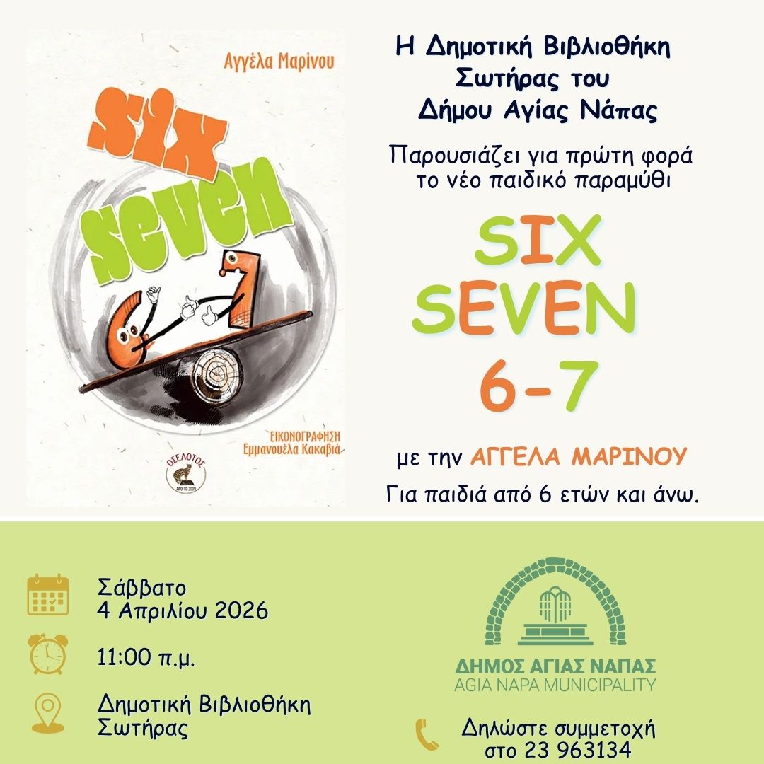 Η Λέσχη Φιλαναγνωσίας της Δημοτικής Βιβλιοθήκης Σωτήρας του Δήμου Αγίας Νάπας σας προσκαλεί σε βιβλιοπαρουσίαση του βιβλίου SIX – SEVEN «67» της συγγραφέως Αγγέλας Μαρίνου.