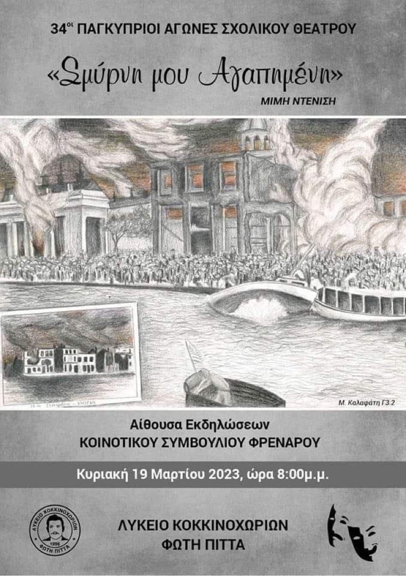 Το Λύκειο Κοκκινοχωρίων Φώτη Πίττα παρουσιάζει τη θεατρική παράσταση «Σμύρνη μου αγαπημένη» στα πλαίσια των 34ων Παγκύπριων Αγώνων Σχολικού Θεάτρου αυτή την Κυριακή, 19.3.2023 στις 8.00 μ.μ. στο Κοινοτικό Μέγαρο Φρενάρου.