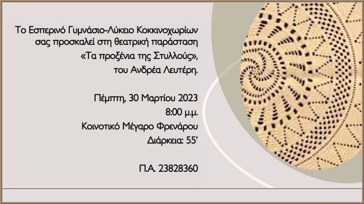 Το Εσπερινό Γυμνάσιο- Λύκειο Κοκκινοχωρίων προσκαλεί το κοινό στη θεατρική παράσταση «Τα προξενιά της Στυλλούς», του Ανδρέα Λευτέρη την Πέμπτη 30 Μαρτίου στις 20:00μμ στο Κοινοτικό Μέγαρο Φρενάρου.