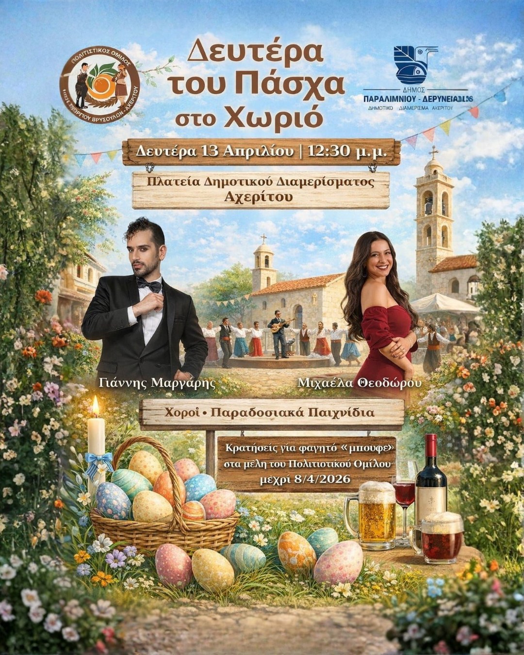 Δευτέρα του Πάσχα με ένα ξεχωριστό γλέντι γεμάτο μουσική, φαγητό και διασκέδαση την Δευτέρα του Πάσχα 13 Απριλίου 2026, ώρα 12:30 το μεσημέρι στην Πλατεία Δημοτικού Διαμερίσματος Αχερίτου