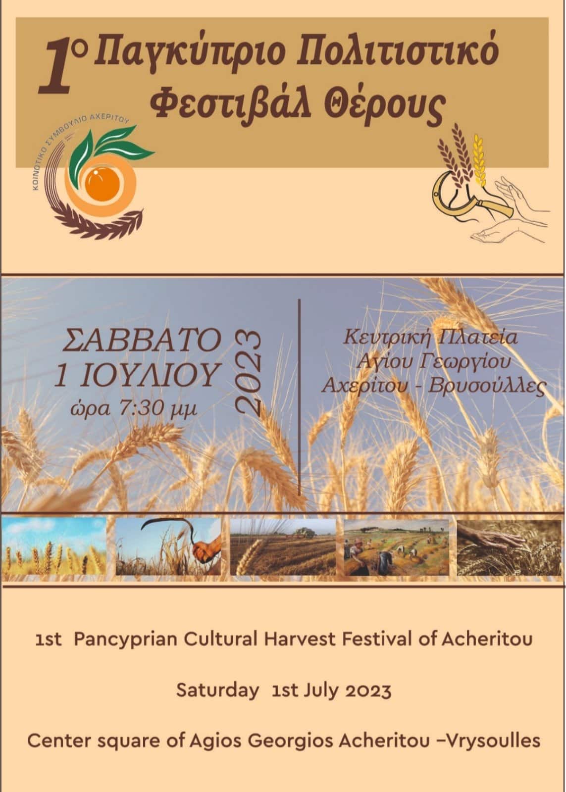 Το Κοινοτικό Συμβούλιο Αχερίτου, σε τακτική συνεδρίαση στις 10 Απριλίου 2023 αποφάσισε την διοργάνωση του 1ου Παγκύπριου Πολιτιστικού Φεστιβάλ Θέρους που θα πραγματοποιηθεί το Σάββατο 1η Ιουλίου 2023 στην κοινότητά μας.