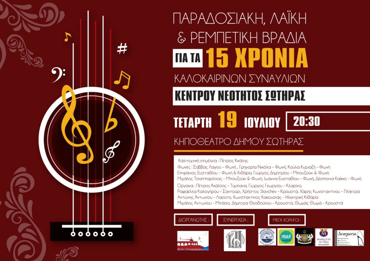 Συναυλία διοργανώνει απόψε στις 8:30 στο Κηποθέατρο του Δήμου Σωτήρας το Κέντρο Νεότητας γιορτάζοντας τα 15 χρόνια ζωής και προσφοράς.