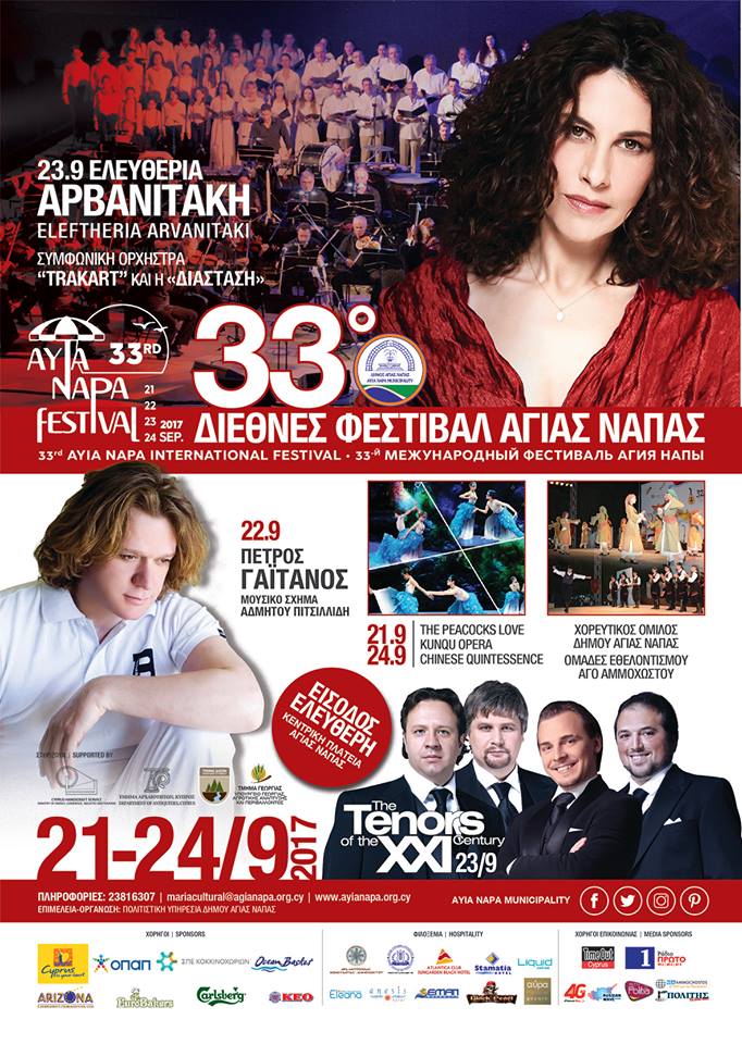 Το 33ο Διεθνές Φεστιβάλ Αγίας Νάπας θα διεξαχθεί φέτος από τις 21 μέχρι και τις 24 Σεπτεμβρίου στην Κεντρική Πλατεία Αγίας Νάπας και στον χώρο του μοναστηριού με πολλές εκδηλώσεις.