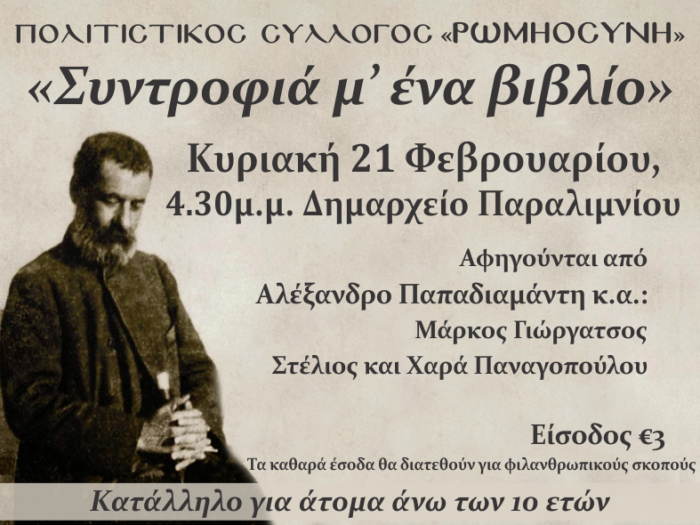 Ο Μάρκος Γιώργατσος μαζί με τον Στέλιο και τη Χαρά Παναγόπούλου αφηγούνται με τη συνοδεία μουσικής γνωστά διηγήματα από τη γραφίδα του Αλέξανδρου Παπαδιαμάντη και άλλων διηγηματογράφων της ρωμηοσύνης στην εκδήλωση με τίτλο “Συντροφιά μ’ ένα βιβλίο”, την Κυριακή 21 Φεβρουαρίου στις 4:30 το απόγευμα στην Αίθουσα ΕΚδηλώσεων Δημαρχείου Παραλιμνίου.