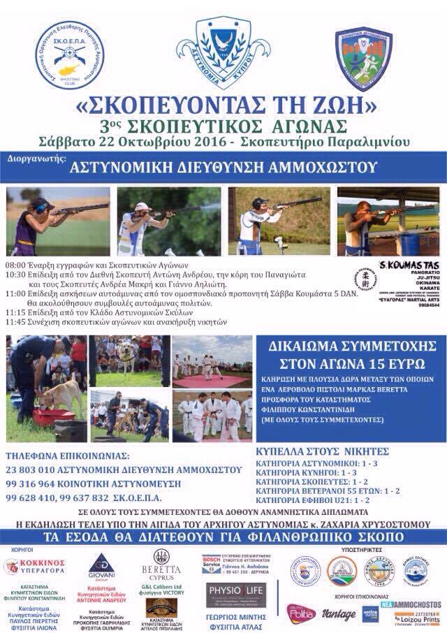 Πραγματοποιούνται σήμερα Σάββατο στο Σκοπετήριο Παραλιμνίου από τις 8 το πρωί από την Αστυνομική Διεύθυνση Αμμοχώστου σε συνεργασία με την Σκοπευτική Οργάνωση Επαρχίας Αμμοχώστου και την Κοινοτική Αστυνόμευση της επαρχίας μας οι 3οι Φιλανθρωπικοί Σκοπευτικοί Αγώνες Αμμοχώστου.