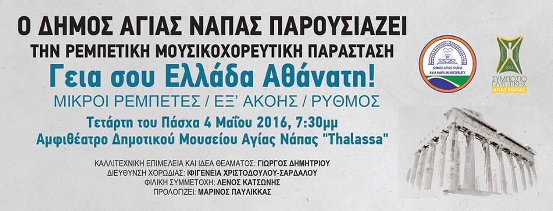 Στο Μουσείο “Thalassa” Αγίας Νάπας θα βρεθεί απόψε η Νεανική Χορωδία Σωτήρας “Μικροί Ρεμπέτες”, καλεσμένοι από τον Δήμο Αγίας Νάπας για να συμμετάσχουν στο καλλιτεχνικό πρόγραμμα που εντάσσεται στα πλαίσια του 3ου Διεθνούς Συμποσίου Γλυπτικής Αγίας Νάπας.