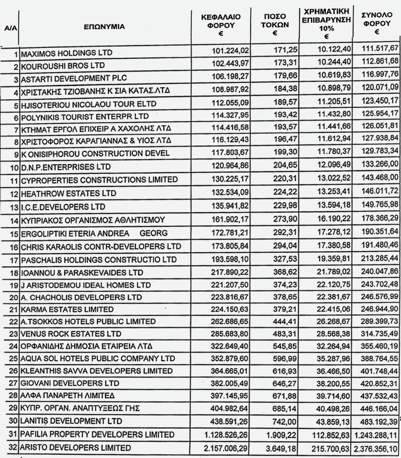 Στον κατάλογο του ΤΕΠ, ενδεικτικές είναι οι περιπτώσεις της εταιρείας «Aristo Developers» που οφείλει το ποσό των 2,37 εκατ. και της «Pafilia Property Developers» που οφείλει το ποσό των 1,24 εκατ.