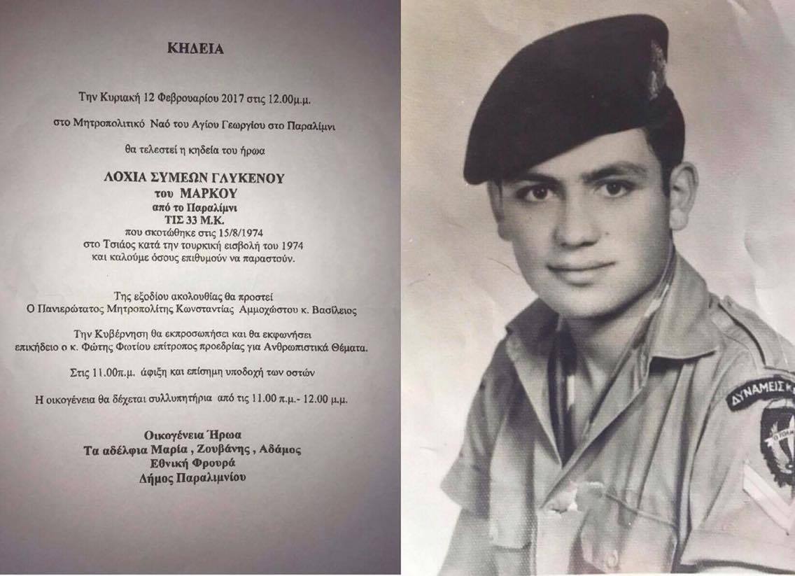Την Κυριακή, 12 Φεβρουαρίου 2017, θα τελεστεί στον Μητροπολιτικό Ναό Αγίου Γεωργίου Παραλιμνίου η κηδεία του Παραλιμνίτη Ήρωα της τουρκικής εισβολής του 1974, Λοχία της 32ης Μοίρας Καταδρομών, Συμεών Μάρκου Γλυκαίνου, τα λείψανα του οποίου βρέθηκαν με τη μέθοδο του DNA.