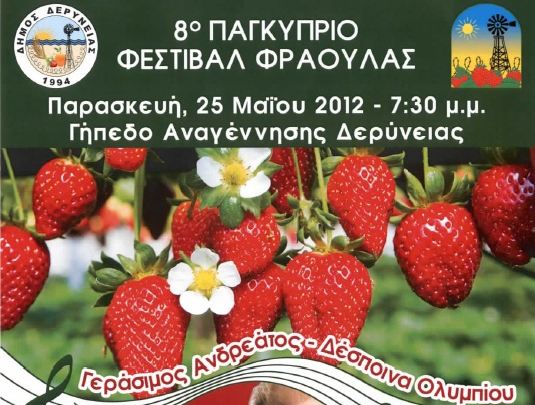 Οπως δήλωσε στο Κυπριακό Πρακτορείο Ειδήσεων ο Δήμαρχος Δερύνειας Αντρος Καραγιάννης, ”οι φραουλοπαραγωγοί και οι σύζυγοί τους ετοιμάζουν πυρετωδώς τα παρασκευάσματα της φράουλας, όπως λικέρ, μαρμελάδα και χυμό, που θα προσφερθούν δωρεάν στον κόσμο που θα παρευρεθεί στο Φεστιβάλ Φράουλας που αρχίζει στις 19.30 το βράδυ της Παρασκευής 25 Μαΐου”.