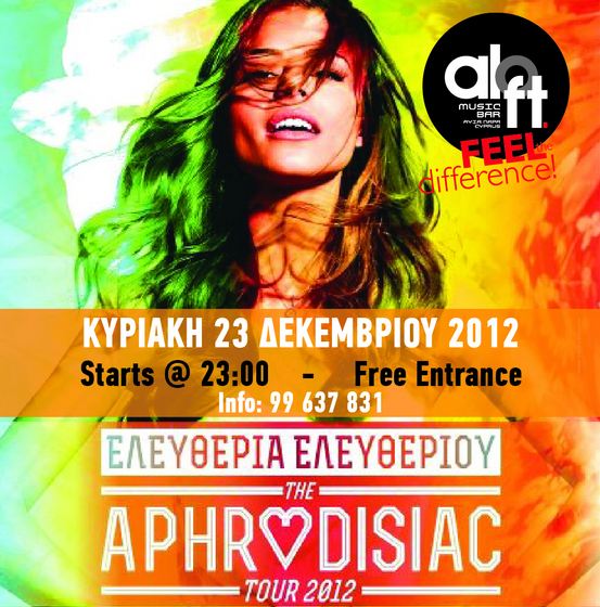 Σταθμό στην περιοδεία της με τίτλο “Aphodisiac” θα κάνει η Ελευθερία Ελευθερίου στο Aloft Music Bar στην Αγία Νάπα την Κυριακή 23 Δεκεμβρίου στις 23:00. Η είσοδος θα είναι ελεύθερη για όλους.