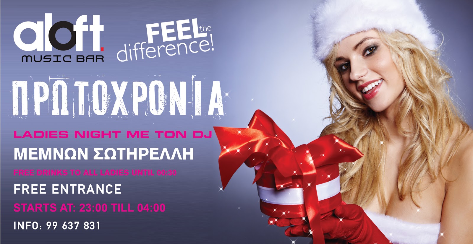 Το Aloft Music Bar στην Αγία Νάπα σας προσκαλεί να συνεχίσετε την διασκέδαση για την υποδοχή του νέου έτους μέχρι τα θημερώματα με ένα Ladies Night, παρέα με το μοναδικό μουσικό παραγωγό Μέμνωνα Σωτηρέλη. Η είσοδος θα είναι δωρεάν ενώ θα υπάρχουν δωρεάν ποτά μέχρι και τις 12:30 τα μεσάνυχτα για όλες τις γυναίκες.Για περισσότερες πληροφορίες: 99637831