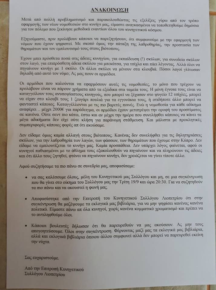 Αποτέλεσμα όλων αυτών είναι και η πρόσφατη απόφαση του Κυνηγετικού Συλλόγου Λιοπετρίου που αναμένεται να ξεσηκώσει σειρά άλλων αντιδράσεων.