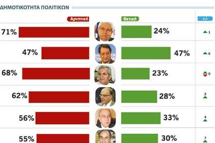Οι δημοτικότητες όλων των πολιτικών αρχηγών και του Προέδρου εξακολουθούν να καταγράφουν αρνητικό πρόσημο στο ισοζύγιο κρίσεων, με τις θετικές κρίσεις να προέρχονται κυρίως από τον ιδεολογικό χώρο στον οποίο ανήκουν, χωρίς να κερδίζουν σημαντική υποστήριξη από άλλες ιδεολογικές παρατάξεις. Ο Πρόεδρος καταγράφει τη χαμηλότερη συγκριτικά δημοτικότητα από όλους τους προηγούμενους Προέδρους της Δημοκρατίας, με μόνο 24% των πολιτών να του απονέμουν θετική ψήφο. Στον χώρο του ΑΚΕΛ καταγράφει ποσοστό 67%, ενώ εισπράττει 31% αρνητικές κρίσεις. Στα ίδιο πλαίσιο κινείται και ο κ. Κυπριανού, με 23% θετικές κρίσεις στο σύνολο του πληθυσμού, ενώ εισπράττει 68% θετικές ψήφους και 28% αρνητικές από τους Ακελικούς. Η δημοτικότητα του κ. Καρογιάν είναι 28%, δύο μονάδες μεγαλύτερη από ό,τι τον Δεκέμβριο, εισπράττοντας σημαντικές θετικές κρίσεις από τους ψηφοφόρους του ΔΗΣΥ (49%), εξακολουθώντας όμως να καταγράφει αρνητικό ισοζύγιο στο κόμμα του. Οι κύριοι Ομήρου και Συλλούρης καταγράφουν αύξηση τεσσάρων και επτά μονάδων αντίστοιχα σε σύγκριση με τον Δεκέμβριο, ενώ στο ίδιο περίπου ποσοστό κυμαίνεται η δημοτικότητα της κ. Παναγιώτου.