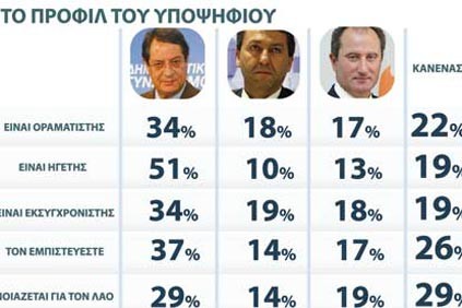 Σύμφωνα με τα αποτελέσματα στο τεστ αξιολόγησης ικανοτήτων διακυβέρνησης, ο υποψήφιος που πληροί σε μεγαλύτερο βαθμό αυτά τα χαρακτηριστικά και τις ικανότητες είναι ο Νίκος Αναστασιάδης, ενώ οι δύο βασικοί συνυποψήφιοί του δεν κατόρθωσαν ακόμη να επιβεβαιώσουν στους πολίτες ότι μπορούν να ανταποκριθούν με επιτυχία στις σημερινές δύσκολες συνθήκες. Αντίθετα, ο δείκτης αξιολόγησής τους στις ικανότητες διακυβέρνησης και πολιτικής προσωπικότητας υπολείπεται σημαντικά σε σύγκριση με το ποσοστό εκλογικής τους επιρροής, αφού τόσο ο Σταύρος Μαλάς όσο και ο Γιώργος Λιλλήκας δεν πείθουν ούτε τη μάζα των ψηφοφόρων των κομμάτων που τους υποστηρίζουν.