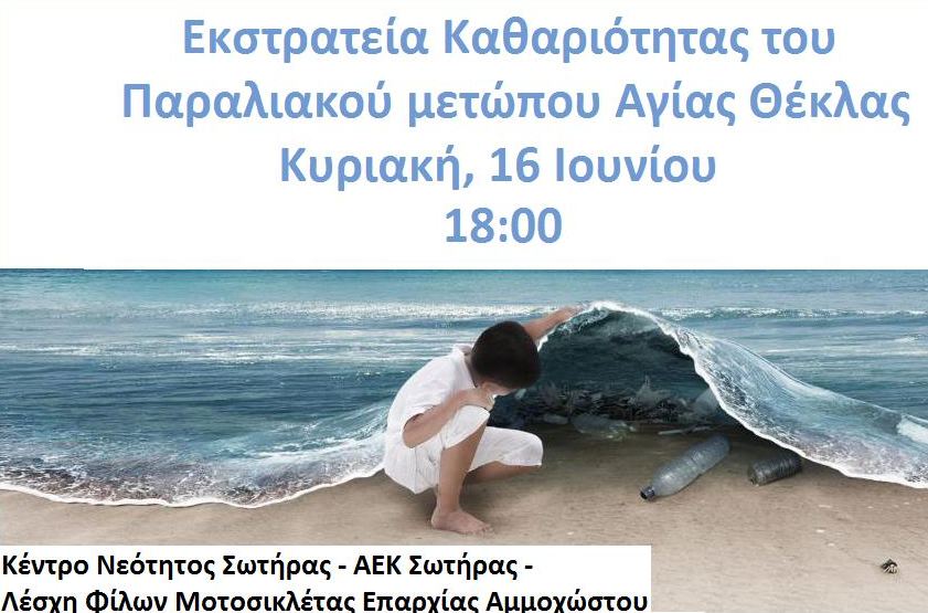 Ακόμα μια χρονιά πιστοί στο ραντεβού για την καθαριότητα του παραλιακού μετώπου της Σωτήρας, το Κέντρο Νεότητος Σωτήρας σε συνεργασία με την ΑΕΚ Σωτήρας και τη Λέσχη Φίλων Μοτοσικλέτας Αμμοχώστου διοργανώνουν σήμερα Κυριακή, 16 Ιουνίου και ώρα 18:00 εκστρατεία καθαριότητας που θα ξεκινήσει από το εκκλησάκι της Αγίας Θέκλας στη Σωτήρα.