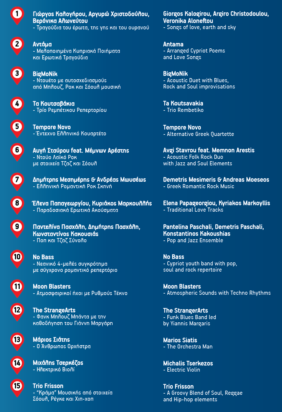Συγκεκριμένα, νεαροί σπουδαίοι καλλιτέχνες, σκορπισμένοι σε 15 διαφορετικά πόστα κατά μήκος του παραλιακού πεζόδρομου της Περνέρα και του Πρωταρά, ξεκινώντας από το Ξενοδοχείο ΤΕΤΥΚ στη θαλάσσια περιοχή της Περνέρας και καταλήγοντας στο ύψος των Τουριστικών Μονάδων «Yianna Marie», κάτω από το φως της Πανσελήνου θα μας δώσουν τη διαφορετική επιλογή «δι-εξόδου» που αναζητούμε όλοι μας, καθώς οι καλοκαιρινές μας διακοπές πλησιάζουν στο τέλος τους.
