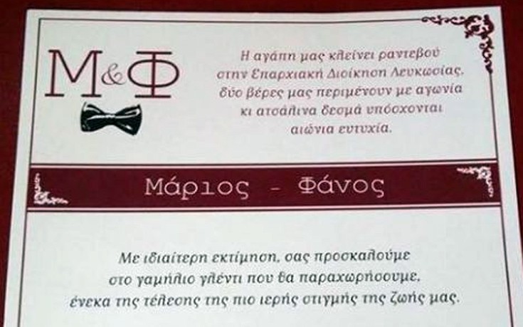 «Η αγάπη μας κλείνει ραντεβού στην Επαρχιακή Διοίκηση Λευκωσίας, δύο βέρες μας περιμένουν με αγωνία κι ατσάλινα δεσμά υπόσχονται αιώνια ευτυχία». Η παραπάνω χαρακτηριστική φράση, «ντύνει» το πρώτο προσκλητήριο για την τέλεση Συμφώνου Συμβίωσης μεταξύ δύο ανδρών στην Κύπρο.