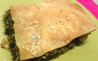 Λαδώνουμε το ταψί του φούρνου, βάζουμε 2 φύλλα λαδωμένα, ρίχνουμε τη γέμιση, τη στρώνουμε και από πάνω βάζουμε άλλα 2 φύλλα επίσης λαδωμένα.