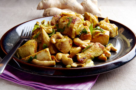Στη συνέχεια, ρίχνουμε τα φρέσκα κρεμμυδάκια και ανακατεύουμε για 1 λεπτό. Προσθέτουμε το τζίντζερ και το κάρι και ανακατεύουμε. Σβήνουμε με το κρασί, χαμηλώνουμε τη φωτιά και αφήνουμε το κοτόπουλο να μαγειρευτεί για 8-10 λεπτά ή μέχρι να εξατμιστούν τα υγρά και το κοτόπουλο να έχει γίνει μέχρι το κέντρο. Κόβουμε ένα κομμάτι για να δούμε αν είναι έτοιμο – αν είναι ροζέ στο εσωτερικό του, προσθέτουμε ελάχιστο νερό και συνεχίζουμε το μαγείρεμα για ελάχιστα λεπτά. Νοστιμίζουμε με αλατοπίπερο και 1 λεπτό προτού κατεβάσουμε το φαγητό από τη φωτιά προσθέτουμε τα κάσιους. Αποσύρουμε και σερβίρουμε με μπόλικο φρεσκοτριμμένο πιπέρι.