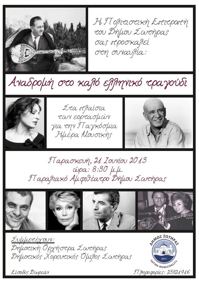 Μία μοναδική βραδιά υπόσχονται να μας χαρίσουν η Δημοτική Ορχήστρα Σωτήρας και ο Δημοτικός Χορευτικός Όμιλος οι οποίοι διοργανώνουν αύριο, Παρασκευή, 21 Ιουνίου μία συναυλία αφιέρωμα στο καλό ελληνικό τραγούδι.