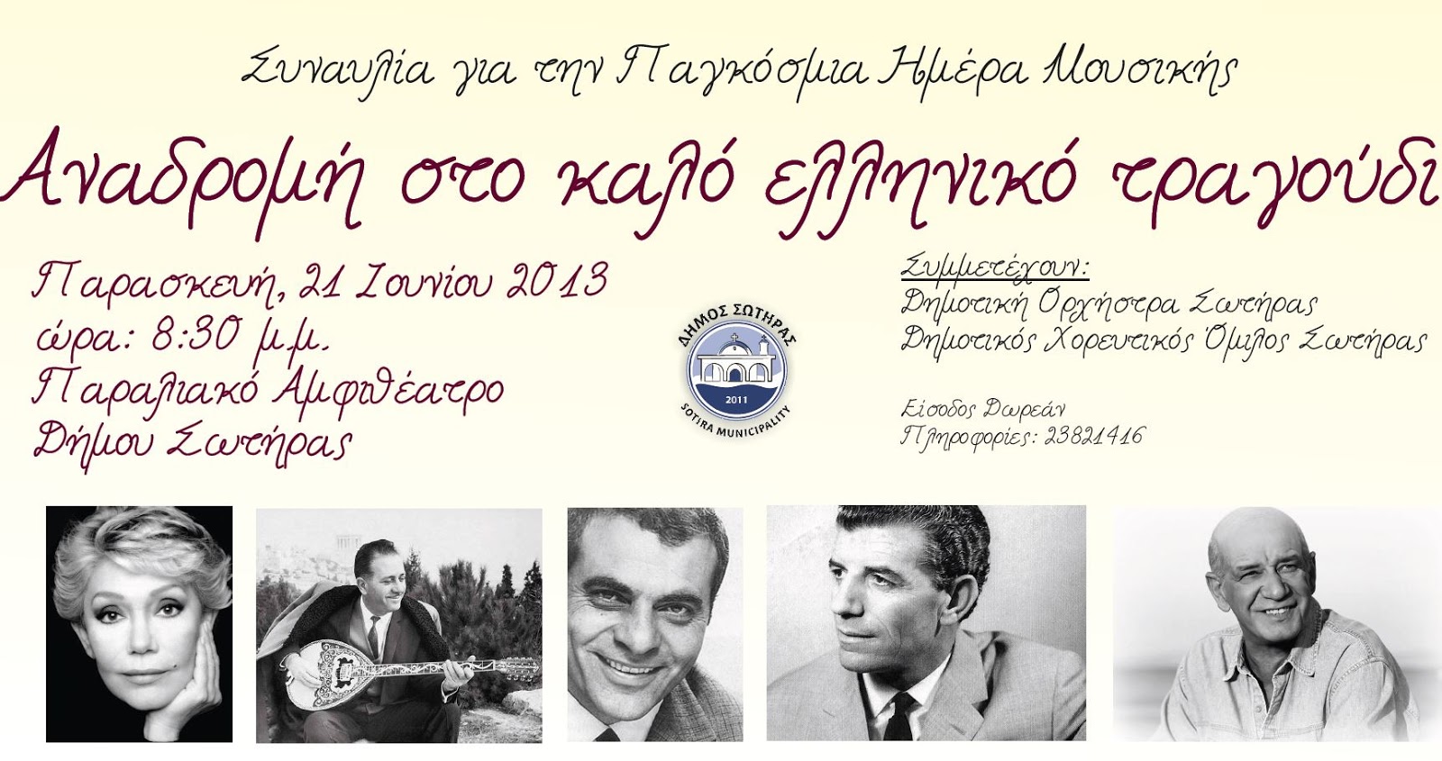 Η εκδήλωση εντάσσεται στα πλαίσια των εορτασμών για την Παγκόσμια Ημέρα Μουσικής και σε αυτήν θα παρουσιαστούν τραγούδια του ελληνικού πενταγράμμου που αγαπήσαμε.
