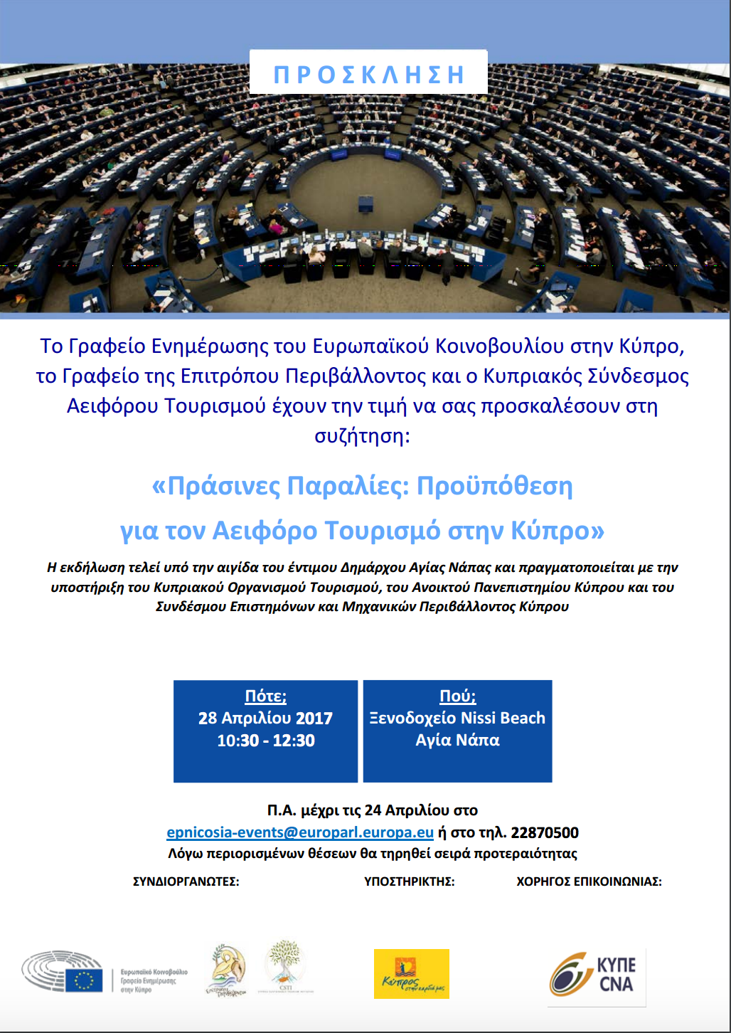 Το Γραφείο Ενημέρωσης του Ευρωπαϊκού Κοινοβουλίου στην Κύπρο, το Γραφείο της Επιτρόπου Περιβάλλοντος και ο Κυπριακός Σύνδεσμος Αειφόρου Τουρισμού διοργανώνουν την ημερίδα «Πράσινες Παραλίες: Προϋπόθεση για τον Αειφόρο Τουρισμό στην Κύπρο».