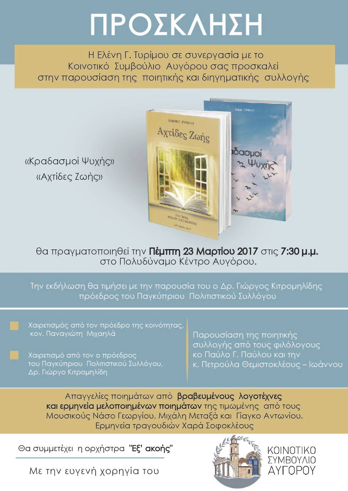 Την εκδήλωση θα τιμήσει με την παρουσία του ο Δρ. Γιώργος Κιτρομηλίδης πρόεδρος του Παγκύπριου Πολιτιστικού Συλλόγου. Παρουσίαση της ποιητικής και διηγηματικής συλλογής από τους φιλόλογους Παύλο Γ. Παύλου και Πετρούλα Θεμιστοκλέους – Ιωάννου.