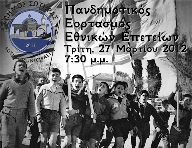 Απόψε, Τρίτη, 27 Μαρτίου στις 7:30 το βράδυ θα διεξαχθεί ο Πανδημοτικός Εορτασμός των Εθνικών Επετείων από το Δήμο Σωτήρας στην Αίθουσα Εκδηλώσεων του Δημοτικού Μεγάρου. Κύριος ομιλητής της εκδήλωσης θα είναι ο κ. Νίκος Τορναρίτης, Πρόεδρος της Επιτροπής Παιδείας της Βουλής των Αντιπροσώπων και Αντιπρόεδρος του Δημοκρατικού Συναγερμού…