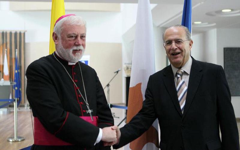 Ο κατ` ουσίαν Υπουργός Εξωτερικών του Βατικανού συναντήθηκε νωρίτερα σήμερα με τον Υπουργό Εξωτερικών Ιωάννη Κασουλίδη, με τον οποίο συζήτησε μια σειρά από ζητήματα και πολιτικές, στα οποία οι δύο πλευρές μοιράζονται κοινές ανησυχίες και είναι, σύμφωνα με τον Κύπριο Υπουργό «οικουμενικής σημασίας».