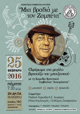 Το Κοινοτικό Συμβούλιο Αυγόρου διοργανώνει αφιέρωμα στον μεγάλο βιρτουόζο του μπουζουκιού Γιώργο Ζαμπέτα, την Πέμπτη, 25 Φεβρουαρίου στις 7:30 το βράδυ στο ΖΗΔΗΠΑ Χωλ στο Αυγόρου με τη Χορωδία του Κοινοτικού Συμβουλίου “Αυκορίτισσα”.