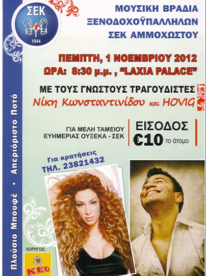 Με τη Νίκη Κωνσταντινίδου και τον Hovig διεξάγεται η μουσική βραδιά των ξενοδοχοϋπαλλήλων της ΣΕΚ αύριο Πέμπτη, στις 8:30 μ.μ. στο “Laxia Palace” στο Παραλίμνι.