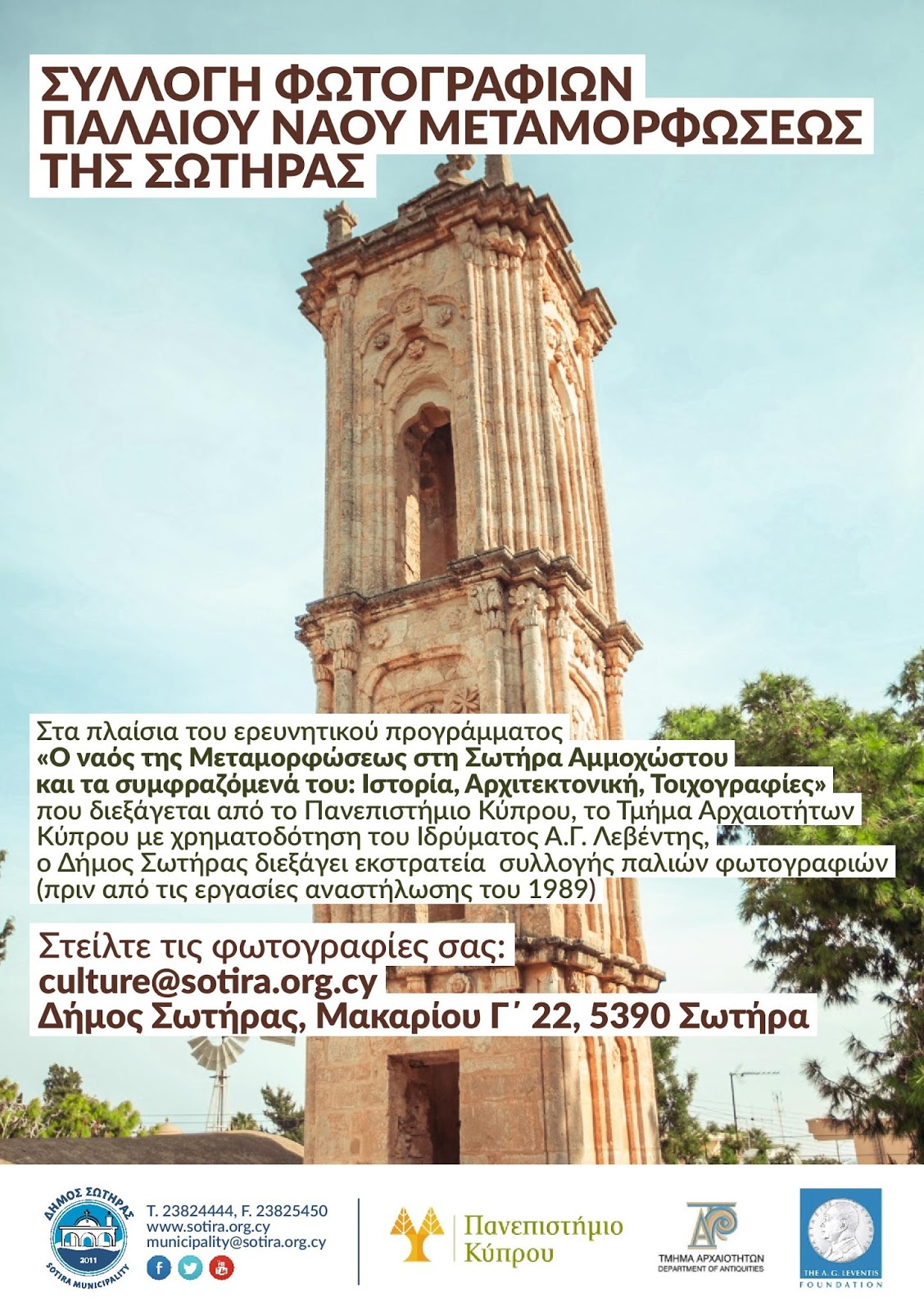 Στα πλαίσια του ερευνητικού προγράμματος του Πανεπιστημίου Κύπρου «Ο ναός της Μεταμορφώσεως στη Σωτήρα Αμμοχώστου και τα συμφραζόμενά του: Ιστορία – Αρχιτεκτονική – Τοιχογραφίες» το οποίο ξεκίνησε τον Ιούνιο του 2014 και πραγματοποιείται σε συνεργασία με το Τμήμα Αρχαιοτήτων Κύπρου, ο Δήμος Σωτήρας διεξάγει εκστρατεία συλλογής παλιών φωτογραφιών. Ο Δήμος Σωτήρας με ανακοίνωσή του προτρέπει όσους διαθέτουν παλιές φωτογραφίες (πριν από την αναστήλωση του 1989) να τις αποστείλουν είτε ταχυδρομικώw στη διεύθυνση Δήμος Σωτήρας, Μακαρίου Γ’ 22, 5390 Σωτήρα, είτε μέσω ηλεκτρονικού ταχυδρομείου στη διεύθυνση culture@sotira.org.cy με σκοπό τη βοήθεια της ερευνητικής ομάδας να ολοκληρώσει την πολύ σημαντική για τη Σωτήρα μελέτη.