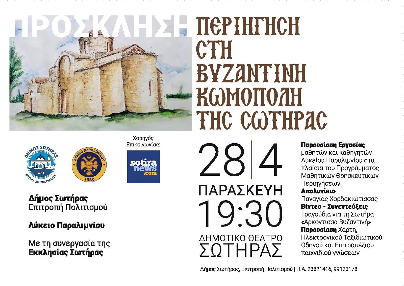 Η Επιτροπή Πολιτισμού του Δήμου Σωτήρας σε συνεργασία με το Λύκειο Παραλιμνίου και την Εκκλησία Σωτήρας διοργανώνουν Εκδήλωση αφιερωμένη στη Βυζαντινή Κωμόπολη της Σωτήρας, με επίκεντρο την προώθηση της Σωτήρας ως τουριστικός προορισμός Προσκυνηματικών Περιηγήσεων την Παρασκευή, 28 Απριλίου στις 7:30μ.μ. στο Δημοτικό Θέατρο Σωτήρας.