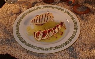 2. Γεμίζουμε το κάθε καλαμάρι με 15 γραμμάρια πιπεριές κόκκινες, 15 γραμμάρια πιπεριές πράσινες, 15 γραμμάρια κρεμμύδι ξερό, 15 γραμμάρια ντομάτα και 20 γραμμάρια κεφαλοτύρι. Τα δένουμε στην άκρη (χρησιμοποιούμε μια οδοντογλυφίδα για να μην αδειάσουν).
