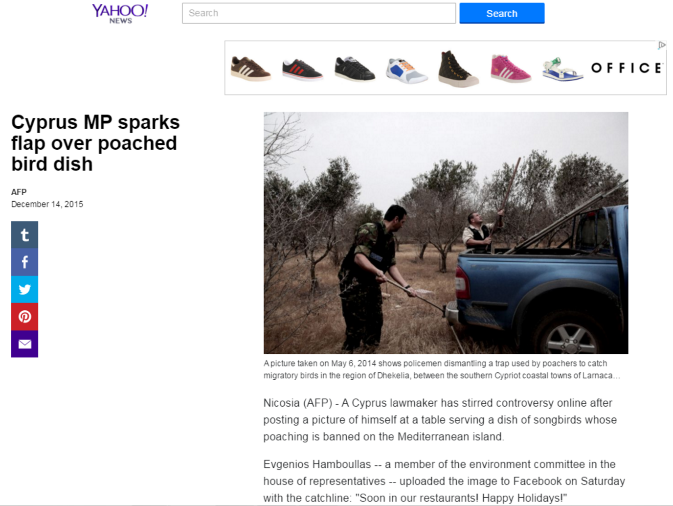 Στο στόχαστρο των Διεθνών Μέσων Ενημέρωσης η παράνομη θήρευση αμπελοπουλιών, Με αφορμή το σάλο για τη φωτογραφία του βουλευτή Ευγένιου Χαμπουλά διεθνή μέσα ενημέρωσης μεταξύ των οποίων και η Guardian, η Mirror, το AFP, η HeraldGlobe και πολλά άλλα πρακτορεία ειδήσεων σχολιάζουν ανρητικά το κυνήγι των αμπελοπουλιών φιλοξενώντας παράλληλα και τα σχόλια των Κύπριων χρηστών, κάτω από τη φωτογραφία.