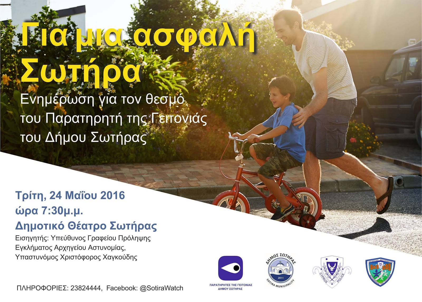 Οι Δημότες της Σωτήρας εκπαιδεύονται για την αντιμετώπιση της εγκληματικότητας στη Σωτήρα. Την Τρίτη 24 Μαΐου 2016, οι Παρατηρητές της Γειτονιάς Σωτήρας προσκαλούν όλους τους δημότες της Σωτήρας σε διάλεξη-εκπαίδευση για τον θεσμό του Παρατηρητή της Γειτονιάς στον Δήμο Σωτήρας.