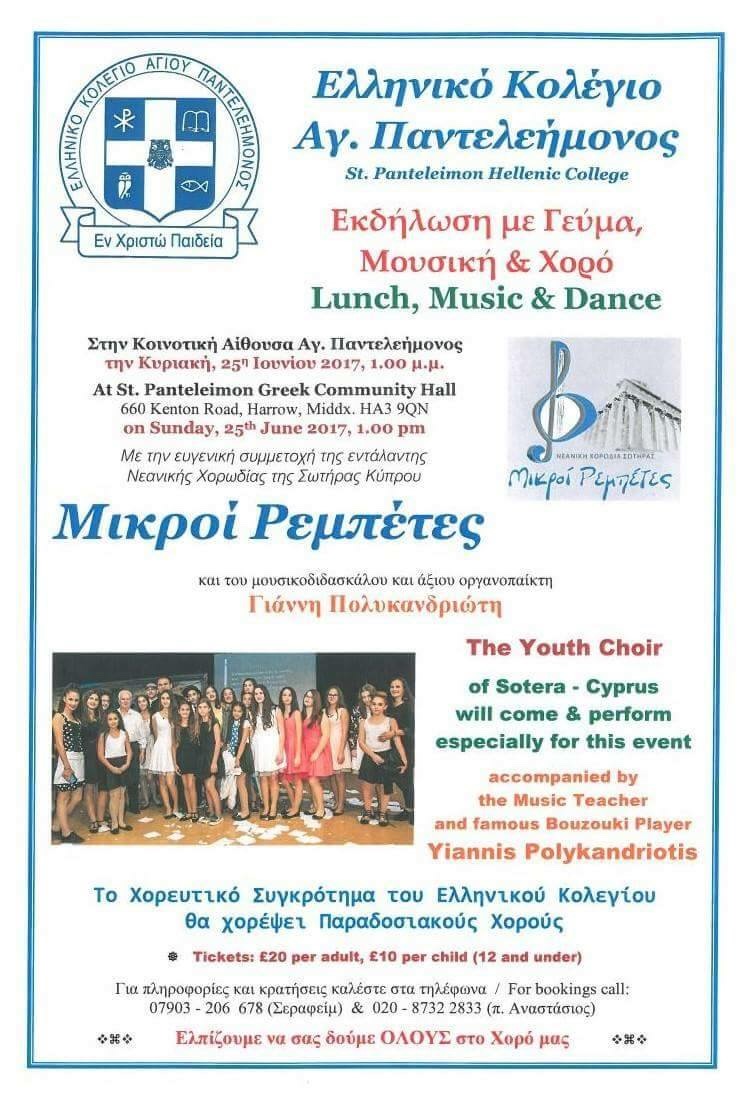 Μαζί τους θα συμμετάσχει και το χορευτικό συγκρότημα του Ελληνικού Κολλεγίου το οποίο θα χορέψει παραδοσιακούς χορούς.