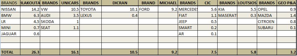 Σε επίπεδο εταιριών ο Όμιλος Πιλακούτα κατέλαβε την πρώτη θέση το 2016 αφού το 26.3% των νέων εγγραφών αφορούν σε μάρκες που εμπορεύεται. Ακολουθεί η Unicars με ποσοστό 16.1% και η Dicran Ouzounian με 10.5%. Η Michaels Automotive κατέχει το 9.2% της αγοράς και η CIC το 7.5% ενώ ακολουθούν η Loutsios Group με 5.8% και η GEO Pavlides & Araouzos με 3.2%.