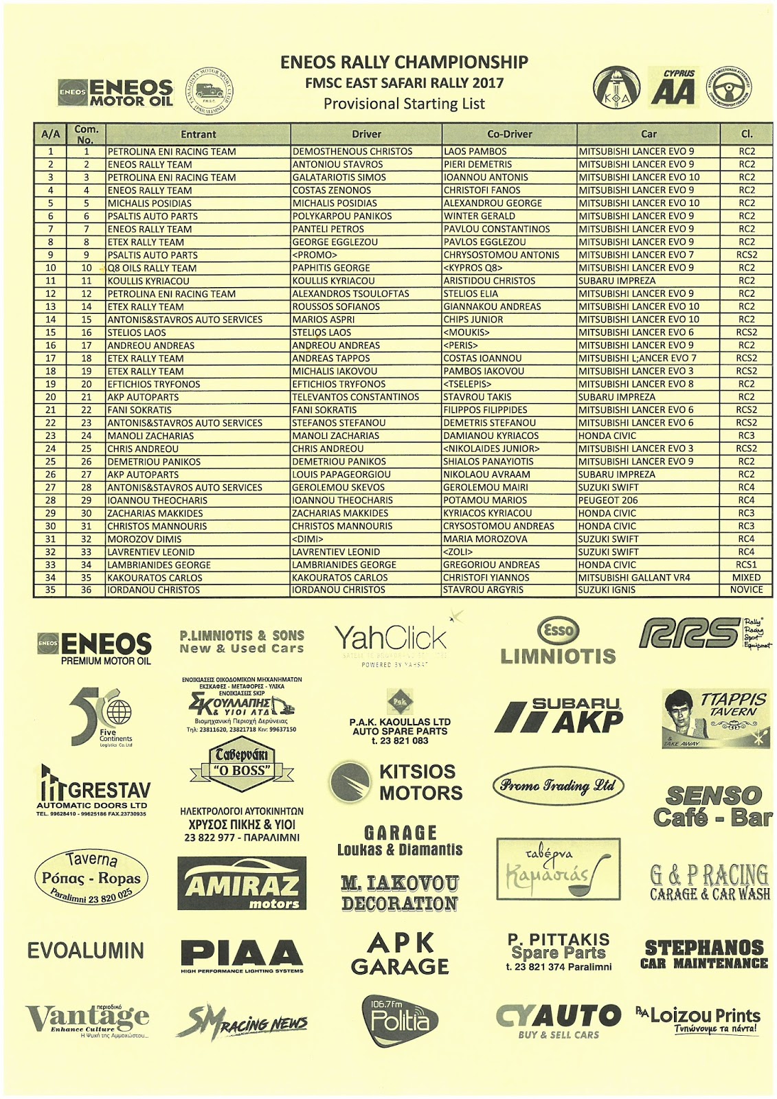 Με 35 συμμετοχές από ολόκληρη την Κύπρο ξεκινά το ερχόμενο Σαββατοκύριακο 11-12 Φεβρουαρίου το καλεντάρι του Παγκυπρίου Πρωταθλήματος Ράλι με την κούρσα της επαρχίας Αμμοχώστου.