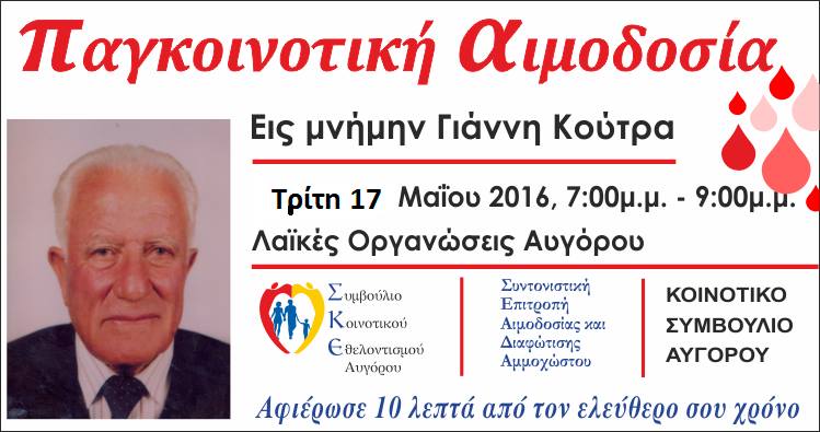 Εθελοντική αιμοδοσία πραγματοποιείται την Τρίτη στο Αυγόρου, εις μνήμη Γιάννη Κούτρα.