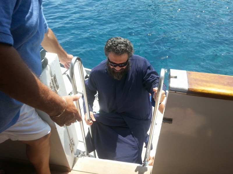 Έτσι αναγκάστηκαν να φέρουν τον πάτερ Ηράκλη πάνω σε σκάφος όπου μαζεύτηκαν και οι ιδιοκτήτες σκαφών για να ακολουθήσουν τον καθιερωμένο αγιασμό.