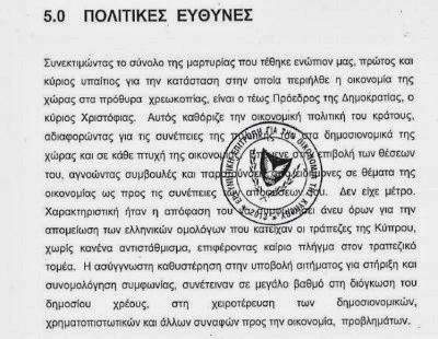 «Συνεκτιμώντας το σύνολο της μαρτυρίας που τέθηκε ενώπιον μας, πρώτος και κύριος υπαίτιος για την κατάσταση στην οποία περιήλθε η οικονομία της χώρας στα πρόθυρα της χρεoκοπίας, είναι ο τέως Πρόεδρος της Δημοκρατίας, ο κύριος Χριστόφιας». Με αυτή την πρόταση αρχίζει την απονομή πολιτικών ευθυνών η Ερευνητική Επιτροπή για την οικονομία. Το SotiraNews έχει στην κατοχή του αυτούσιο το πόρισμα της Επιτροπής.