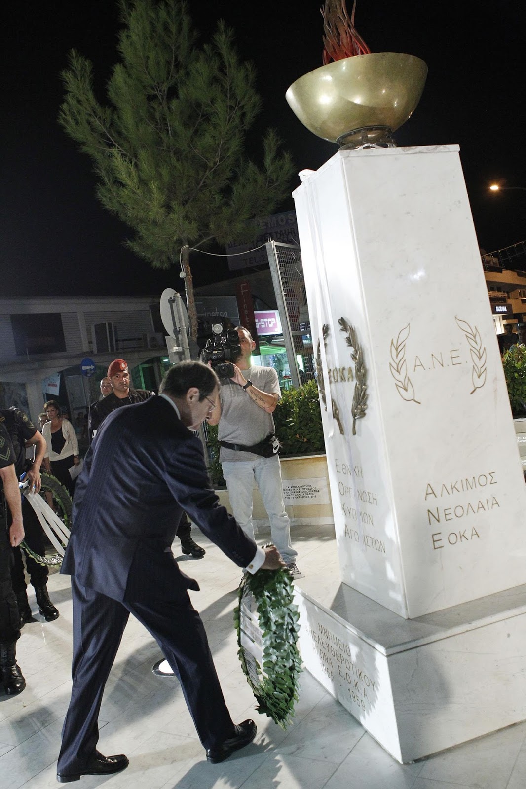Απευθυνόμενος στον Πρόεδρο της Δημοκρατίας, είπε πως η δική του παρουσία «δίνει το ιδιαίτερο χρώμα αυτής της τελετής γιατί φαίνεται η συνέχεια του αγώνα μας που σημαίνει ότι και εμείς, βασιζόμενοι στη δική τους θυσία, στους δικούς τους αγώνες, θα συνεχίσουμε μαζί σας τον αγώνα για την απελευθέρωση της πατρίδας μας, τη δικαίωση του λαού μας και τη δικαίωση όλων των θυσιών που έγιναν για αυτή την πατρίδα που αγαπούμε».