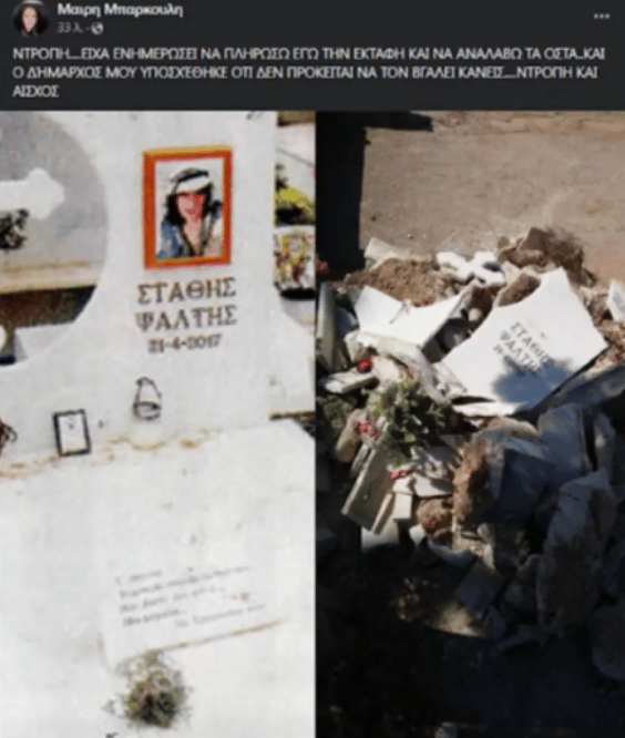 Στην ανάρτηση αναφέρθηκε, ότι η εκταφή του αείμνηστου ηθοποιού έγινε “υπηρεσιακά” και “ουδείς ασχολήθηκε”, ενώ συνοδευόταν από δυο φωτογραφίες. Η μία τραβήχτηκε πριν το σπάσιμο του τάφου και η άλλη μετά.